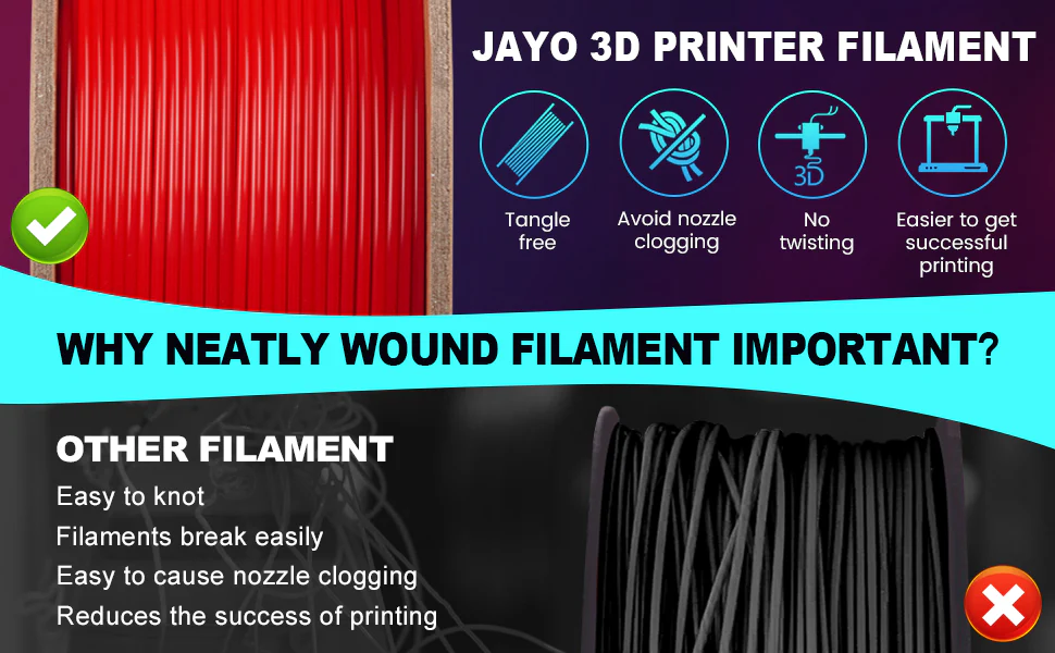 - 【Neatly Wound Filament】Adopting a 100% neatly lined-up filament technique, it is produced using full mechanical winding and strict manual examination. This ensures that JAYO PLA+ 1.1kg filament is tidy and easy to feed. Say goodbye to tangling issues and an unstable printing process.