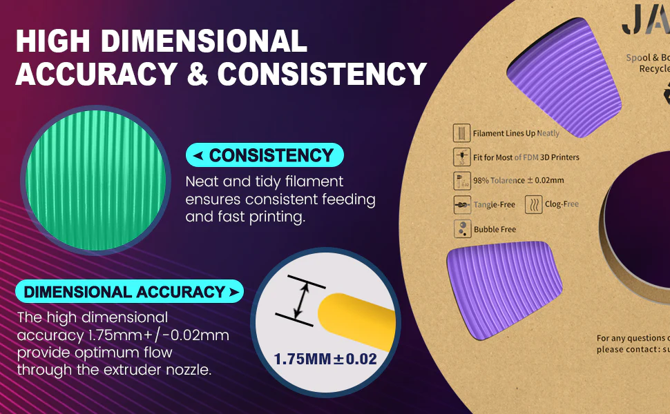 - 【Dimension Accuracy & Tangle】JAYO 1.75mm PLA+ filament is advanced precise diameter measuring during the manufacturing process. The dimensional accuracy is +/- 0.02mm. Besides, with a strict manual inspection to ensure the line is tidy and less-tangle, you can enjoy smooth printing throughout the whole process